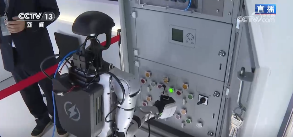 更打动记者的是AI正在从炫酷走向实干。最火热的展柜依然是格斗机器人,可记者心里一直有个问号,它们什么时候才能真正走进我们的生产生活?答案是:越来越近了!其实有一些机器人已经开始运用到了具体的生产实践中,——比如这款经过改造的同款人形机器人正在精准执行电力设备的操作。通过AR调度平台远程控制,工作人员可以指挥它完成旋扭、翻盖、按压这些精细动作。