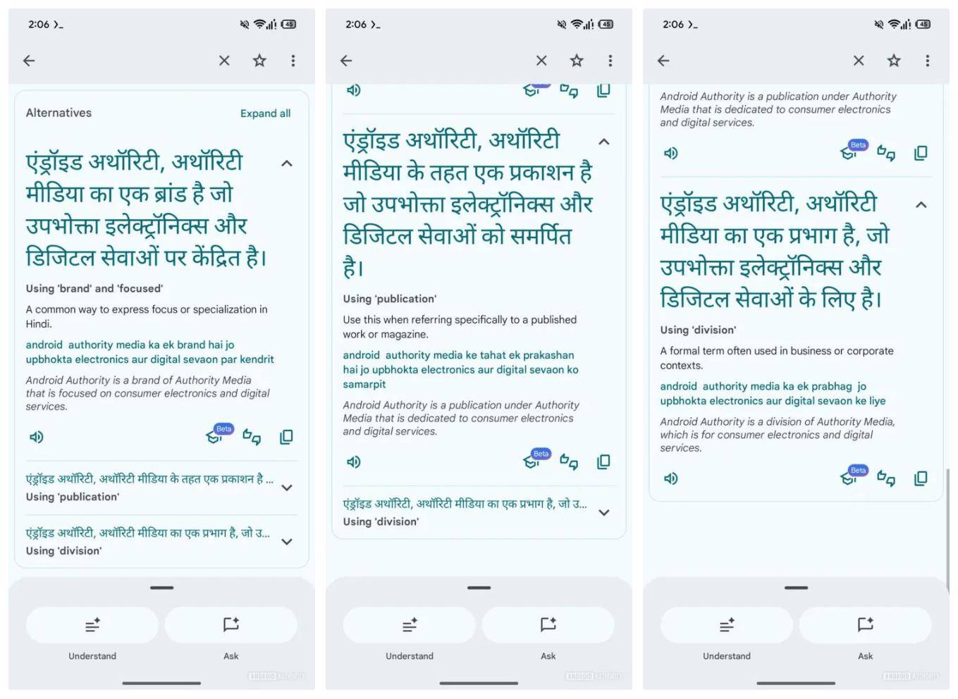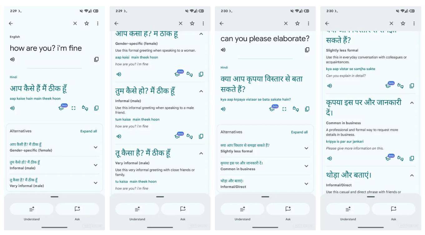 该媒体还指出谷歌翻译为补充背景信息,已着手测试“理解(Understand)”和“提问(Ask)”按钮,而“显示替代译法”极有可能与这两个功能打包推出,形成一套完整的 AI 翻译辅助工具链。
